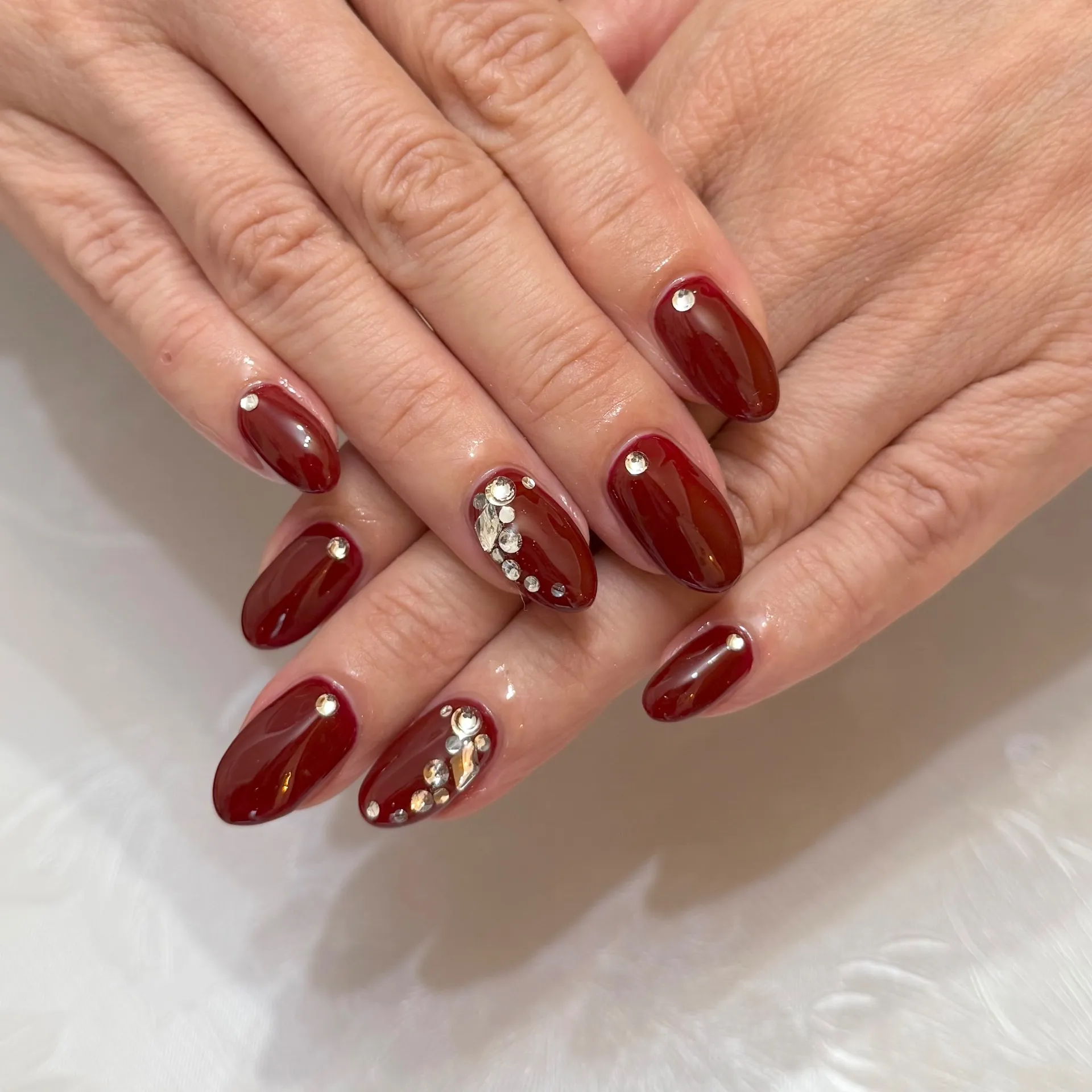 ホリデーシーズンになると、手元にも少し特別感をまとわせたくなります。今回のお客様は、そんな季節にぴったりの深いボルドーをワンカラーでセレクト。指先がすっと細く見える、大人の女性に人気の色味です。